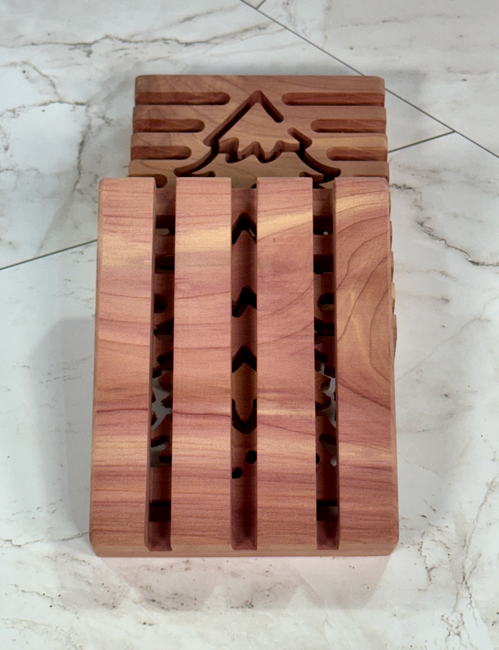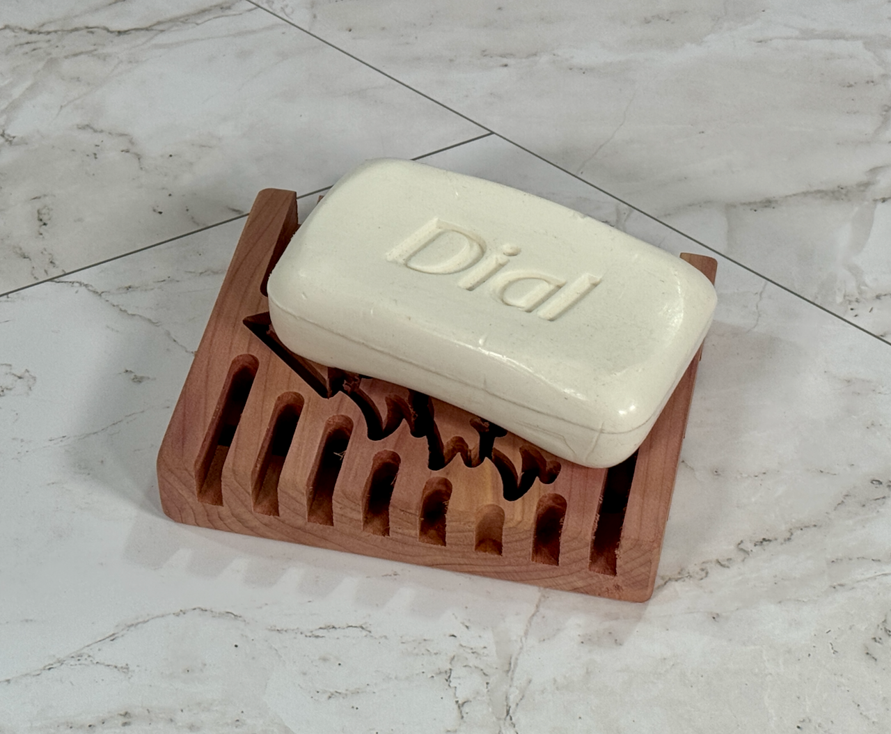 Made in my shop from locally sourced aromatic Eastern Red Cedar wood, each deck measures approximately 4 1/2" long, 3 1/2" wide, 7/8" thick. I use no finish as Eastern Red Cedar is naturally aromatic and resistant to moisture (it will get wet with normal use, but this will not damage the soap deck).