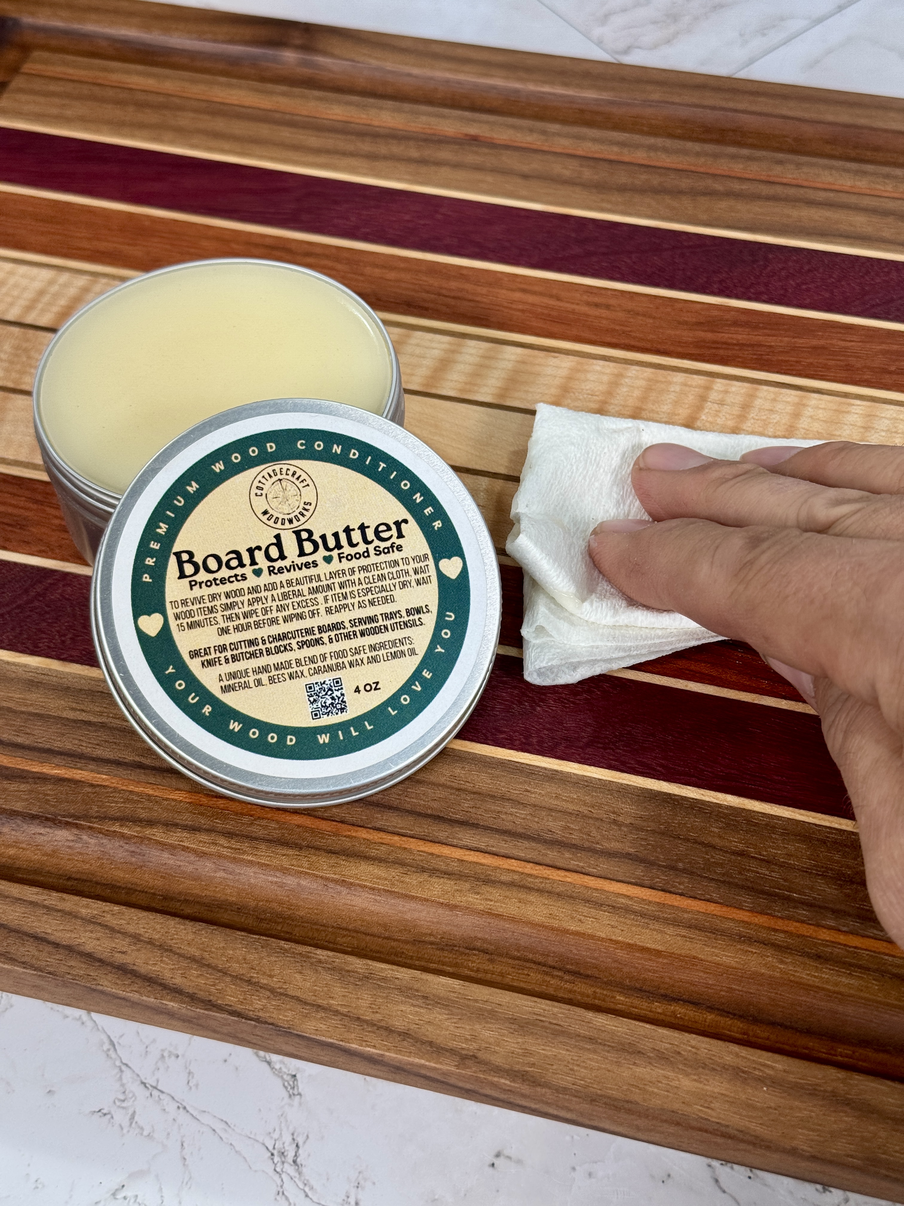 Board Butter Premium Wood Conditioner will revive dry wood and add a beautiful layer of protection to your wood items such as cutting boards, serving trays, wooden bowls and utensils, knife and butcher blocks, charcuterie boards and other wooden items.