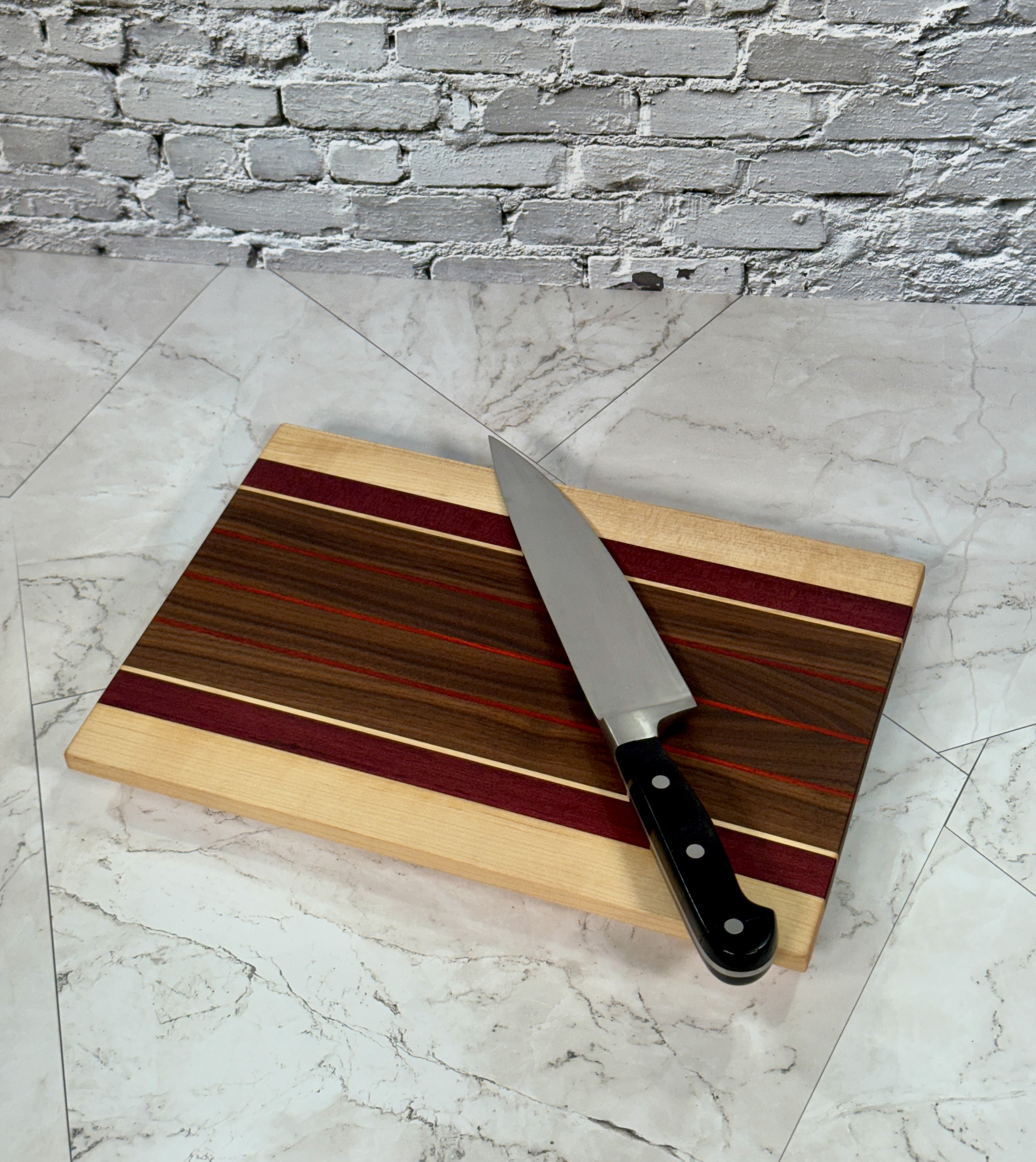 This beautiful petite cutting board is made from select Walnut, Maple, Purpleheart and Padauk.